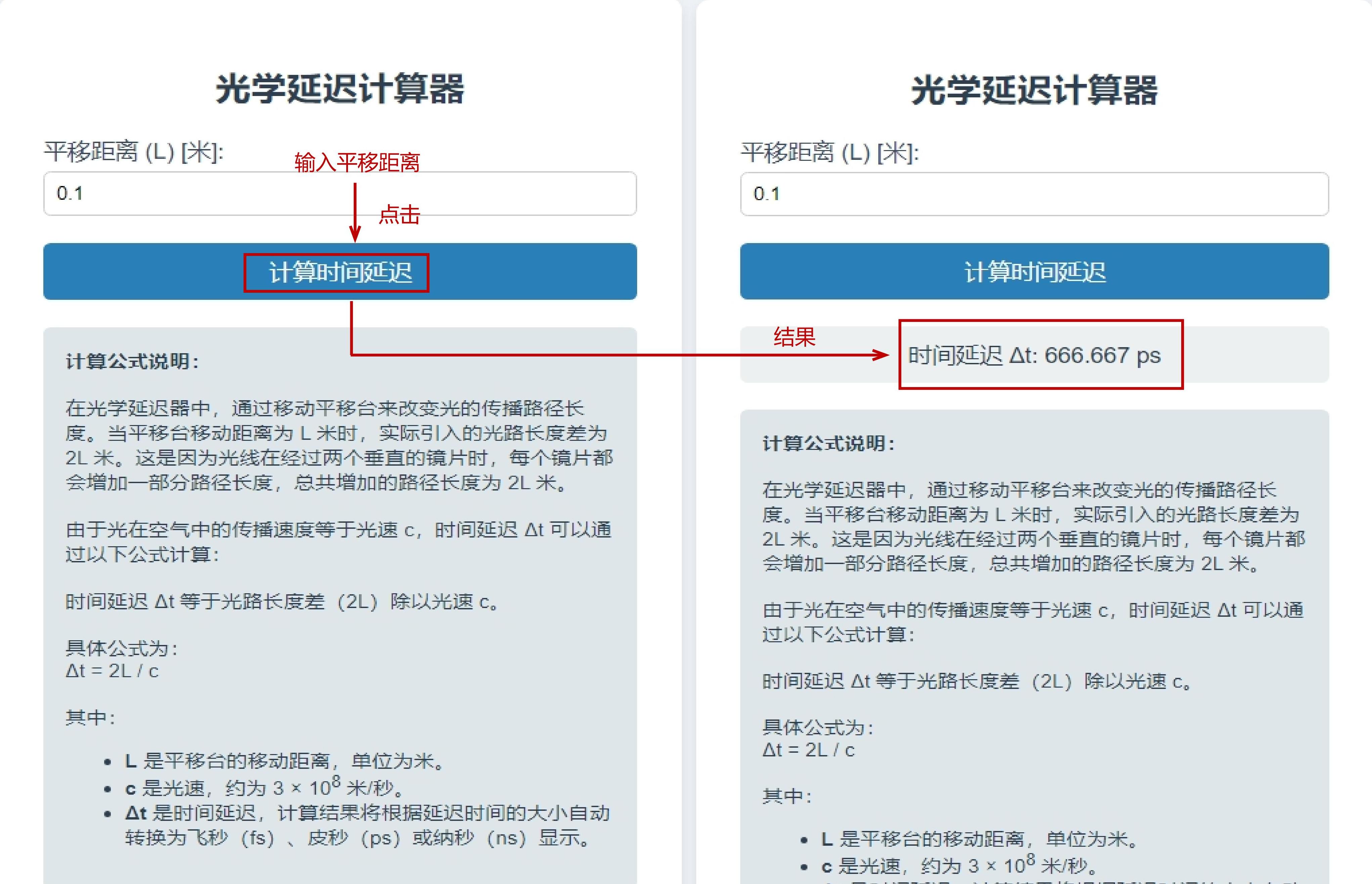 平移距離輸入框:允許用戶輸入平移距離 L,支持精確到四位小數(shù),默認(rèn)值為0.1米。 計(jì)算按鈕:點(diǎn)擊按鈕即可觸發(fā)計(jì)算過(guò)程,立即顯示結(jié)果。 結(jié)果顯示區(qū)域:計(jì)算完成后,時(shí)間延遲Δt會(huì)以合適的單位(fs、ps或ns)顯示在此區(qū)域。 公式說(shuō)明部分:提供詳細(xì)的計(jì)算公式和物理原理,幫助用戶理解計(jì)算過(guò)程。 |