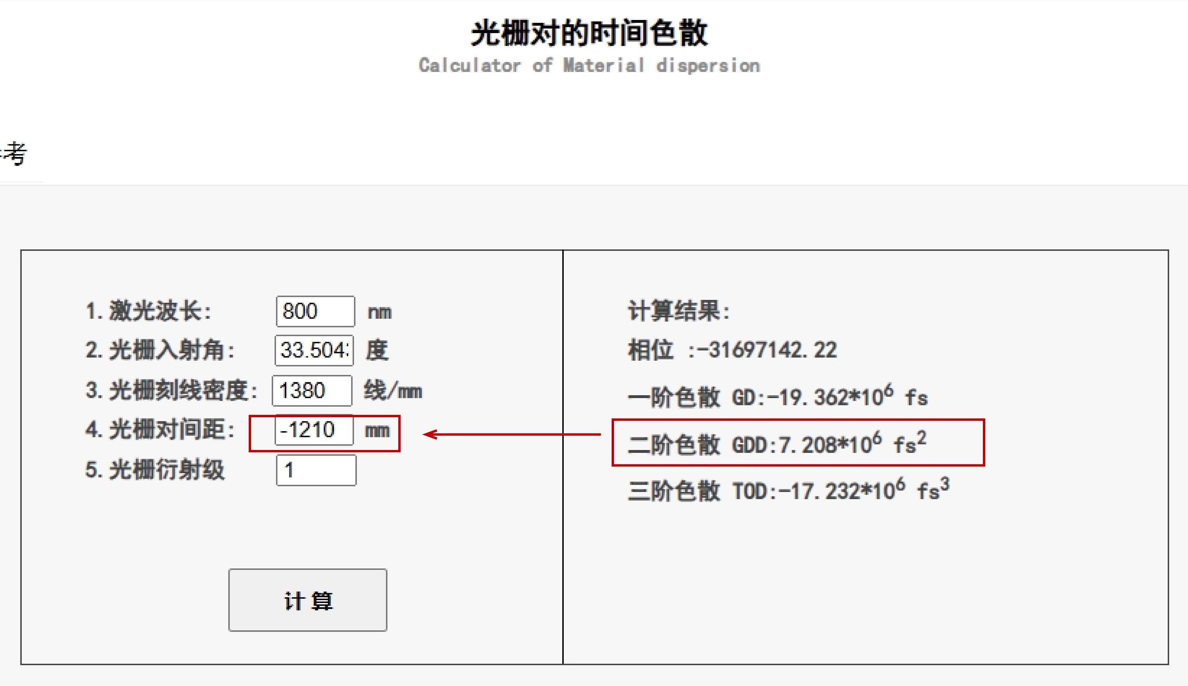 使用1中計算的二階色散和2中計算的入射角。 |