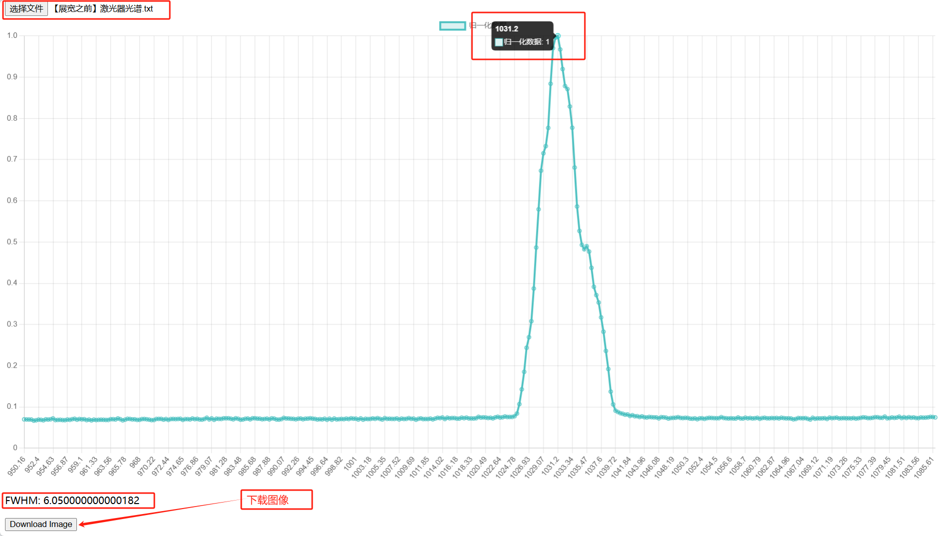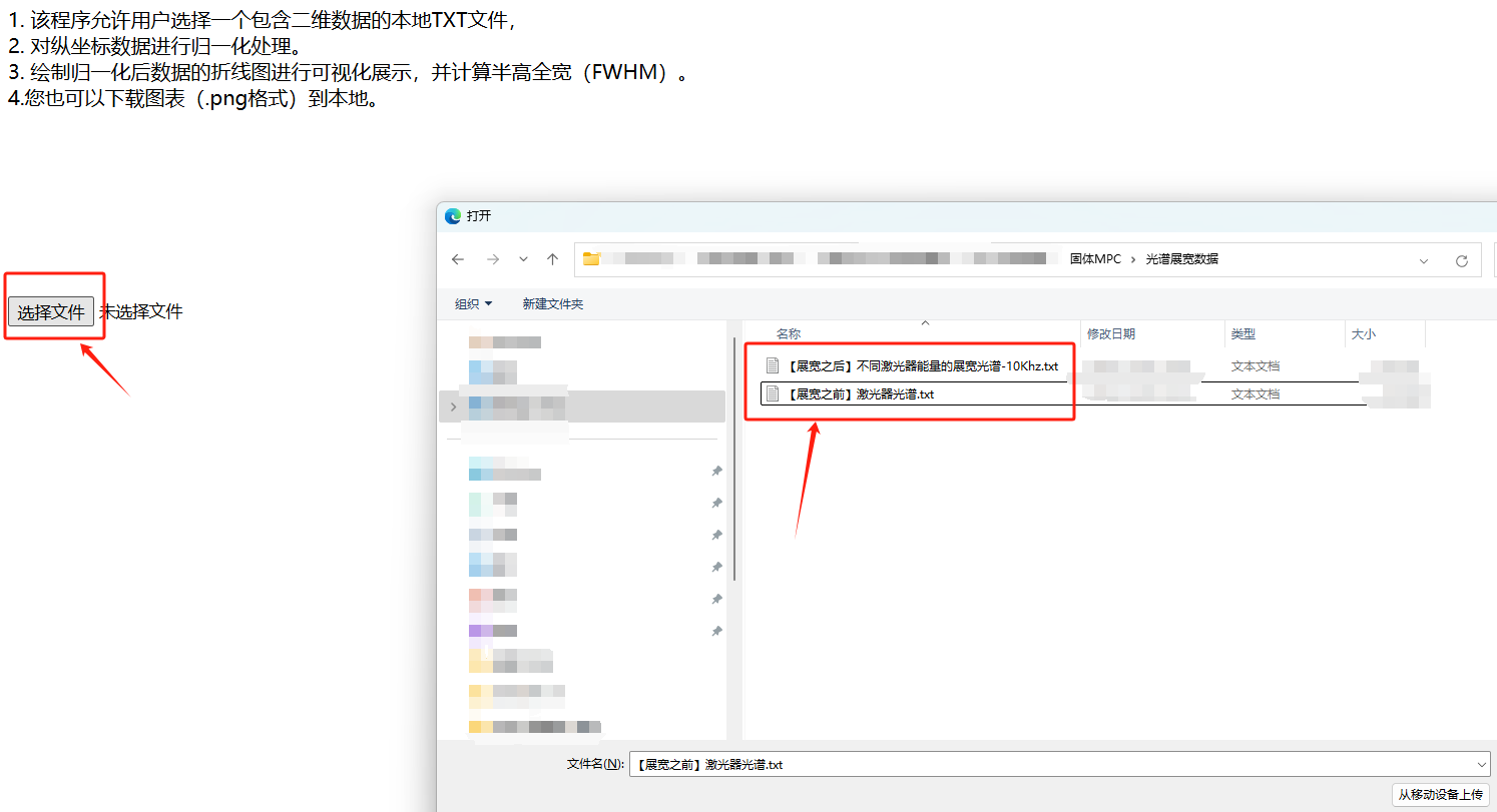 數(shù)據(jù)處理與繪圖:文件上傳后,程序自動(dòng)讀取并解析數(shù)據(jù),進(jìn)行歸一化處理,計(jì)算FWHM,并繪制折線圖。