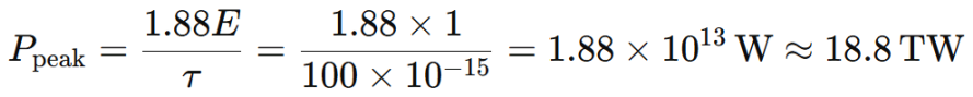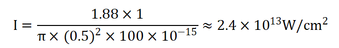 即使用1J能量、0.5cm光束半徑和100fs脈沖持續(xù)時(shí)間的高斯激光脈沖,接可以得到峰值強(qiáng)度達(dá)到約 24TW/cm² 以及約 18.8太瓦(TW) 的峰