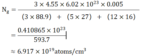 其中: · density 為YAG的密度,約為4.55 g/cm³。 · NA為阿伏伽德羅常數(shù),約為6.02 × 10²³ mol-1。 · dopingLevel 為摻雜濃度,以原子百分比(at.%)表示。 · 分母部分為YAG晶體中各元素的摩爾質(zhì)量總和(Y: 88.9 g/mol, Al: 27 g/mol, O: 16 g/mol)。 |