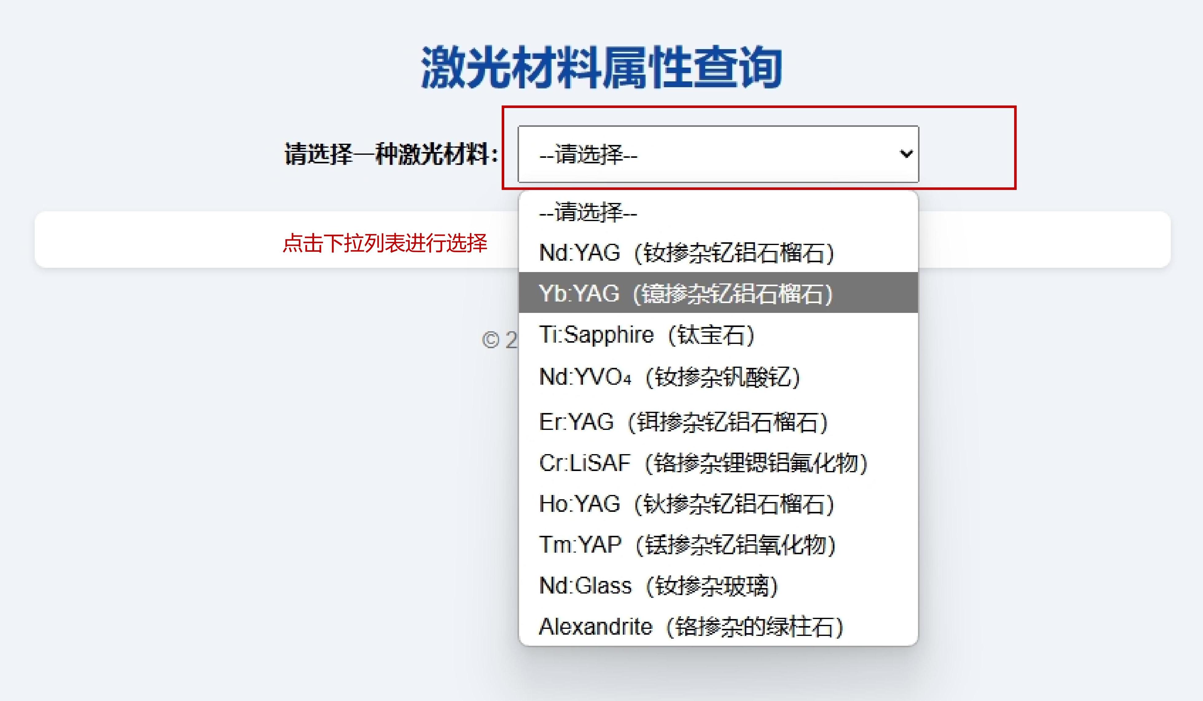 2.選擇材料: 在下拉菜單中選擇所需查詢的激光材料。 |