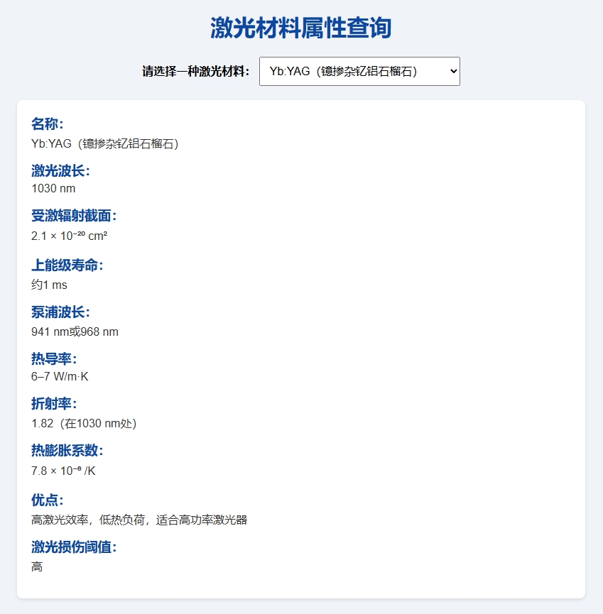 入解析一個名為“激光材料屬性查詢”的網(wǎng)頁源代碼,旨在幫助讀者理解其功能實現(xiàn)的同時,全面認識各種激光材料的特性。