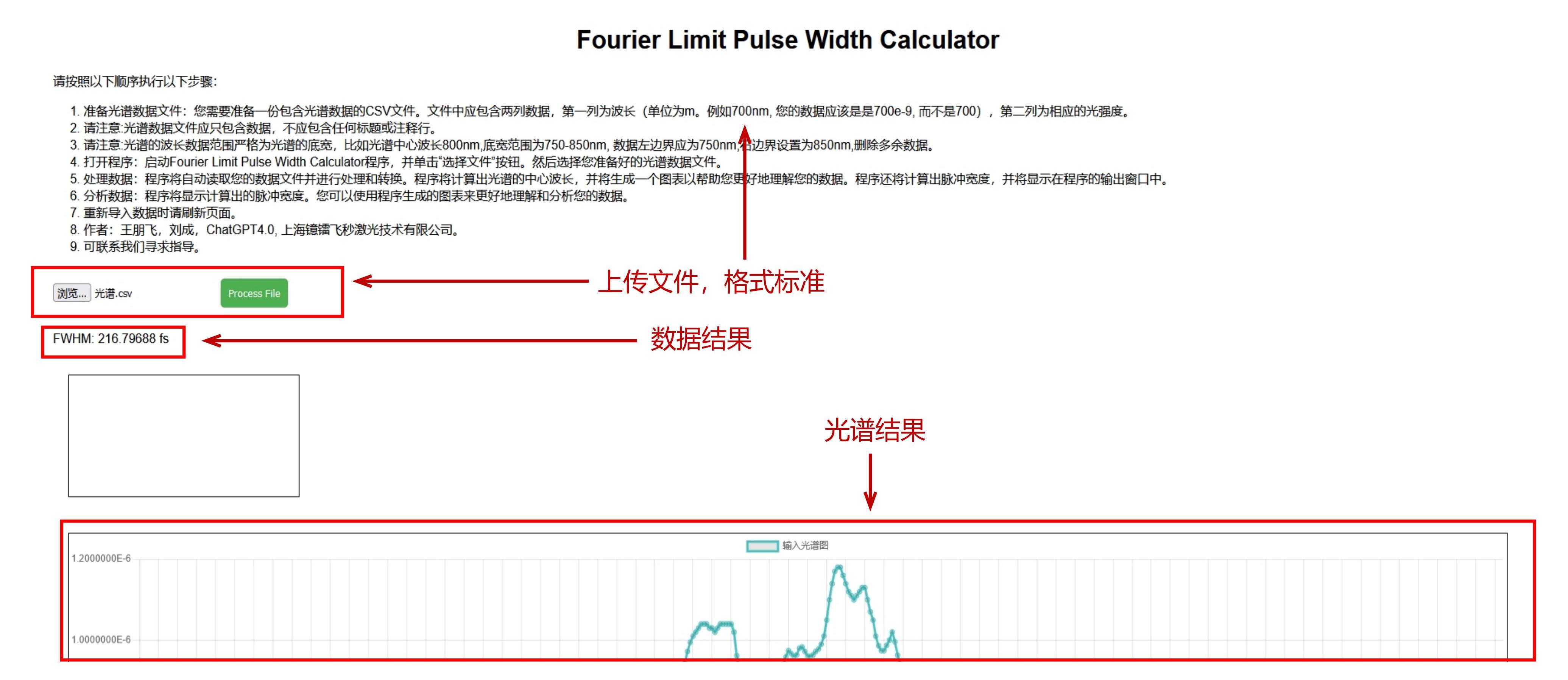 啟動(dòng)程序:打開傅里葉極限脈沖寬度計(jì)算器網(wǎng)頁應(yīng)用。 選擇文件:點(diǎn)擊“選擇文件”按鈕,上傳準(zhǔn)備好的光譜數(shù)據(jù)文件。 自動(dòng)處理:程序?qū)⒆詣?dòng)讀取并解析上傳的CSV文件,計(jì)算光譜的中心波長,并生成對(duì)應(yīng)的光譜圖表,便于用戶直觀理解數(shù)據(jù)分布。