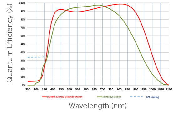 背照式、深耗損、帶eXcelon™技術(shù)和紫外線涂層的幀轉(zhuǎn)移CCD | 增強近紅外,峰值量子效率大于97% | 200-1100 |
