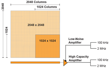 終極的靈活性 雙放大器讀出設(shè)計可優(yōu)化系統(tǒng)性能,高靈敏度放大器減少了弱信號的讀出噪聲。PIXIS-XF通過高容量放大器提供了更大的有效動態(tài)范圍。 |