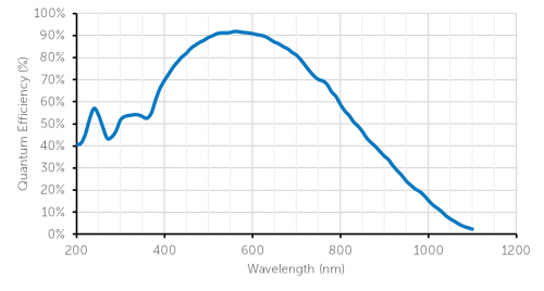 卓越的靈敏度 由于采用背照式照明,COSMOS實(shí)現(xiàn)了極高的光收集效果,達(dá)到了90%以上的峰值量子效率。 COSMOS具有最小的0.7 e-讀出噪聲和0.05 e-/p/s暗電流,能夠檢測到最弱的信號(hào)。 |