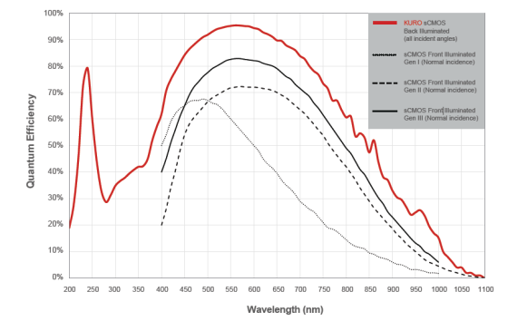 靈敏度高 KURO使用背照式sCMOS探測器,能夠提供大于95%的量子效率,100%的填充因子與現(xiàn)有最靈敏的CCD探測器相匹敵。 由于像素區(qū)域未被遮擋,無論入射角大小,KURO能夠重新捕獲光線,確保最大限度地捕獲光子。 |