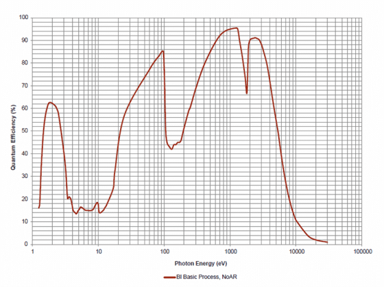 X射線能量靈敏度 PI-MTE3的X射線能量靈敏度在10 eV到30 keV之間,非常適合用于各種軟X射線光譜和成像應(yīng)用,例如X射線顯微成像、X射線等離子體診斷和EUV光刻。 |