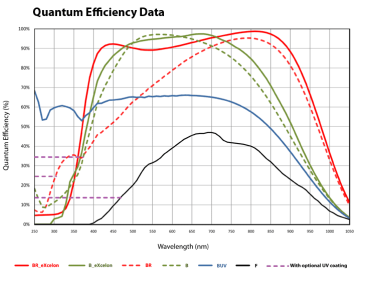 寬范圍的靈敏度 PIXIS提供大約120 – 1100 nm的最寬波長(zhǎng)覆蓋范圍,能夠用于各種廣泛的應(yīng)用。 選定CCDS的量子效率(QE)大于95%,采用紫外線增強(qiáng)型CCD可以在紫外線中獲得較高的量子效率,通過eXcelon™技術(shù)增強(qiáng)了靈敏度并減少了Etaloning效應(yīng)。 |