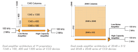終極的靈活性 雙放大器讀出設(shè)計(jì)優(yōu)化了系統(tǒng)性能。高靈敏度放大器減少了弱信號(hào)的讀出噪聲,而高容量放大器則提供了更大的有效動(dòng)態(tài)范圍。 |