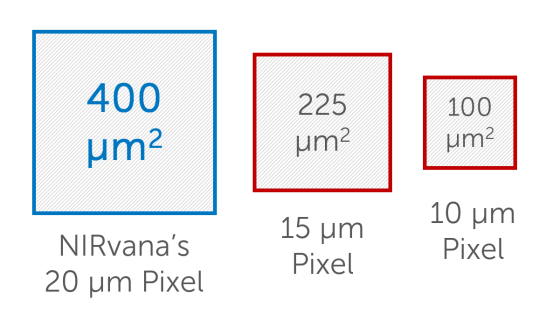 大像素尺寸提供高靈敏度 我們并不止降低了噪聲,我們還收集了更多光子。更大的像素尺寸能夠提高光檢測(cè)能力。NIRvana®系列20μm的像素收集的光比15μm像素相機(jī)多80%,是10μm像素相機(jī)的4倍。 |