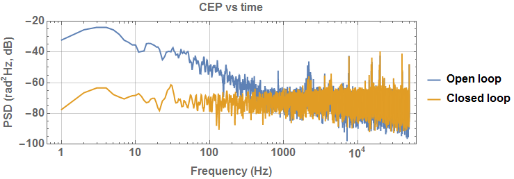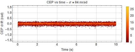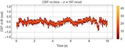 下面的數(shù)據(jù)顯示了4 kHz(與Dazzler閉環(huán))的800 nm OPCPA的CEP測量:79 mrad RMS,單發(fā)。